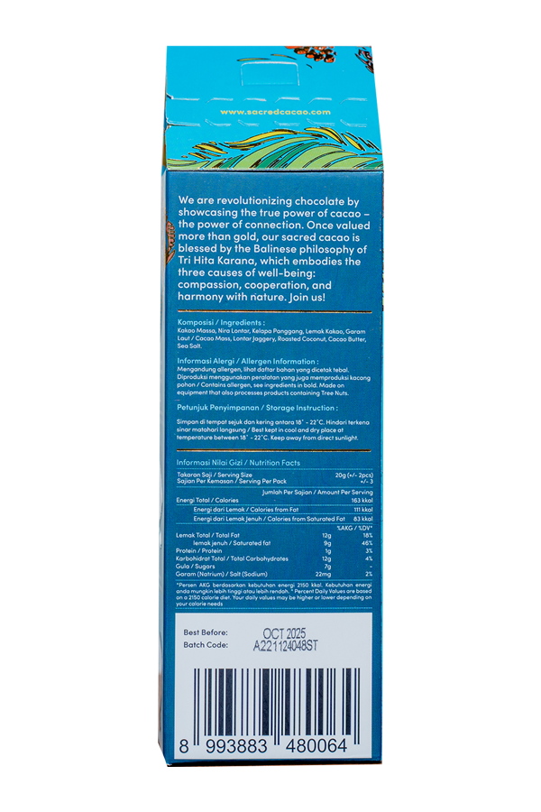 Luxurious raw dark chocolate with roasted coconut. Completely plant-based, sustainably sourced, single origin Jembrana, Bali Chocolate.