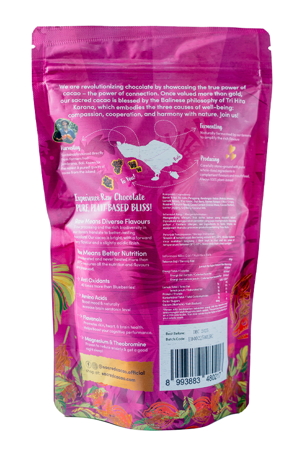 Raw Cacao Rice Crispies is a nutritious and delicious superfood treats made from ceremonial grade Raw Bali Chocolate, puffed rice, lontar jaggery, coconut milk, dried goji berries, and pumpkin seeds. This 100% plant-based snack is minimally processed and packed with antioxidants, vitamins, and minerals, offering a wholesome and flavorful option for a healthy diet.