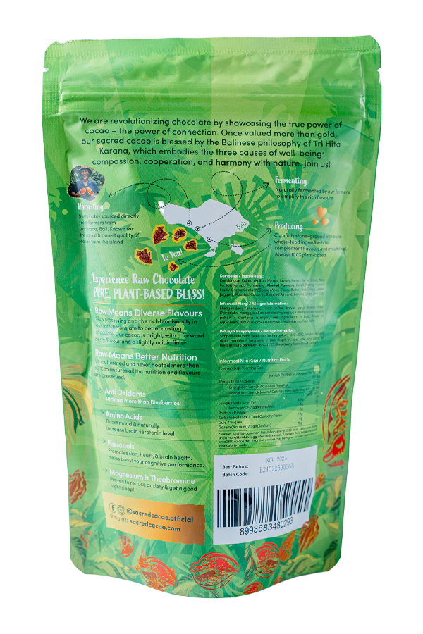 Raw Cacao Rice Crispies is a nutritious and delicious superfood treats made from ceremonial grade Raw Bali Chocolate, puffed rice, lontar jaggery, coconut milk, dried goji berries, and pumpkin seeds. This 100% plant-based snack is minimally processed and packed with antioxidants, vitamins, and minerals, offering a wholesome and flavorful option for a healthy diet.